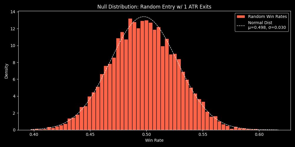 Below is an example of a null distribution , it represents the win rate(test statistic) of 10,000 backtests that use random timing for trade entries.